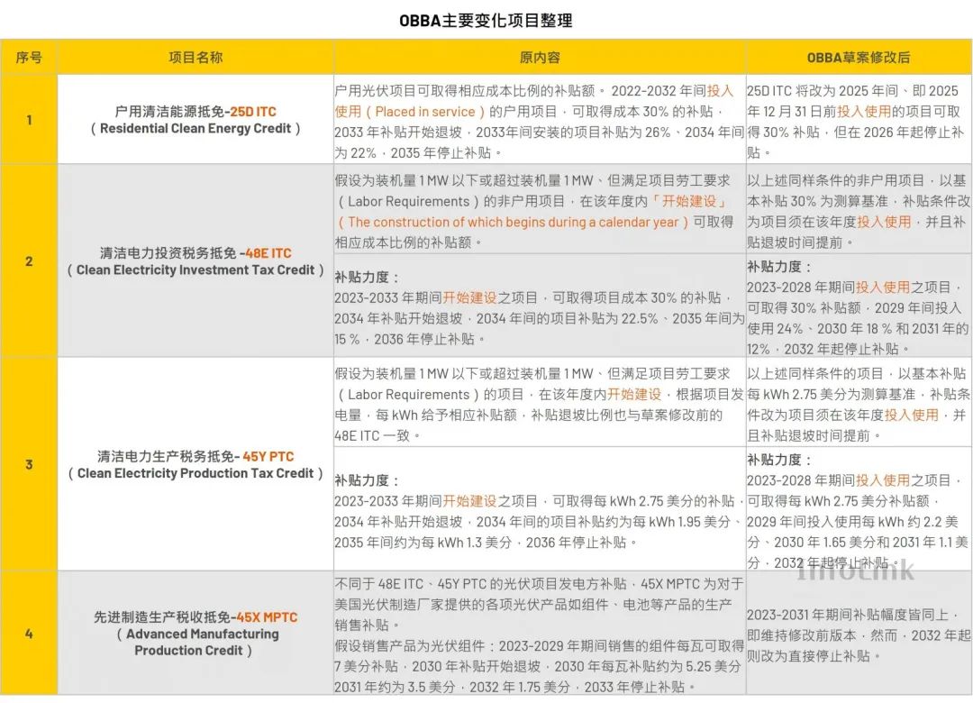 美东时间2025年5月22日,美国众议院以215票赞成、214票反对、1票弃权的极小差距,通过了《大而美法案》(OneBigBeautifulAct,OBBA)草案。该草案对《降低通膨法案》(InflationReductionAct,IRA)中的多项光伏补贴机制进行调整。